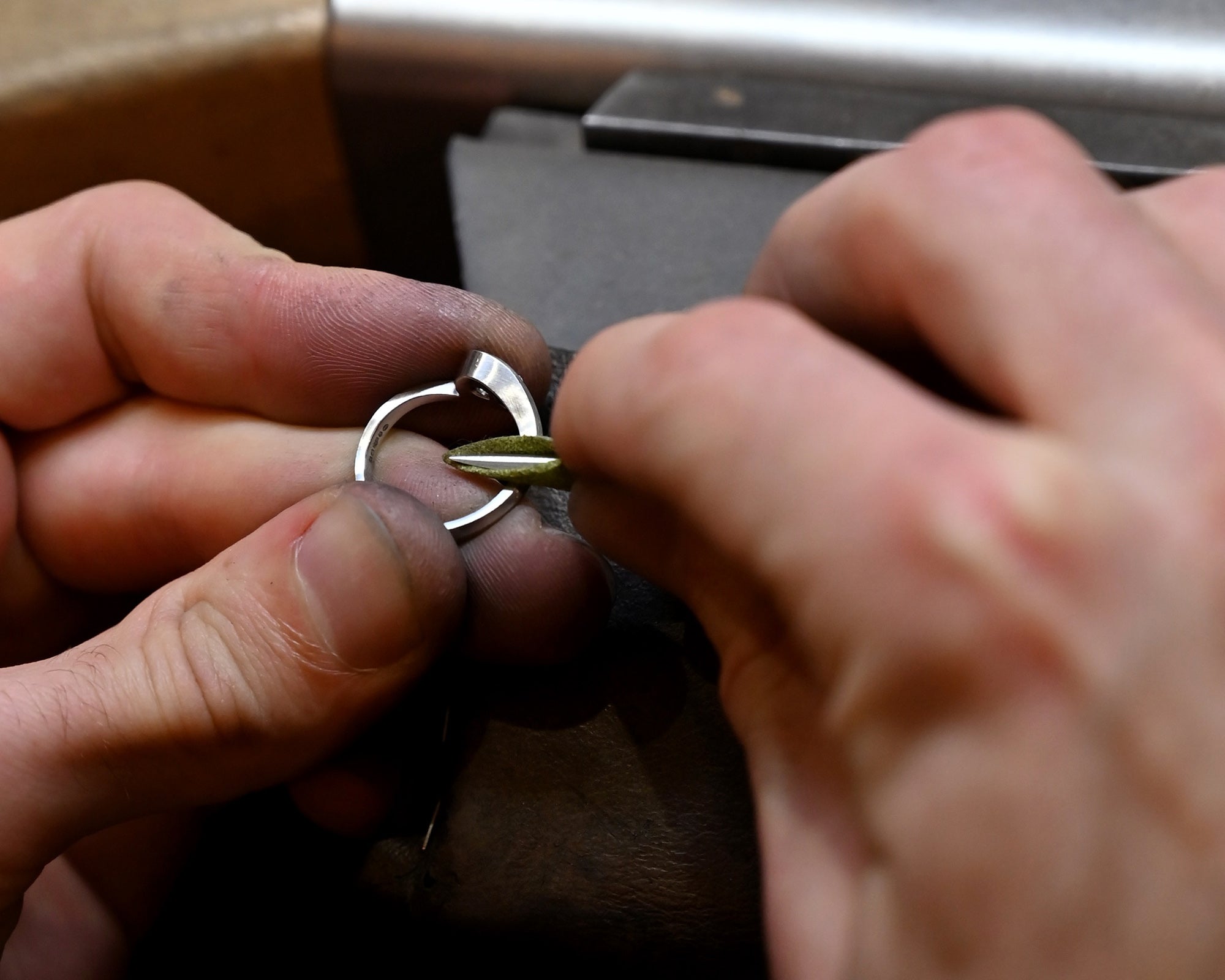 Here, every detail matters, from wielding a custom hammer to craft their signature dimpled textures to setting stones