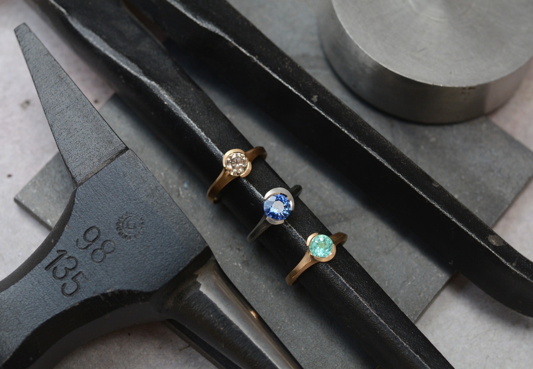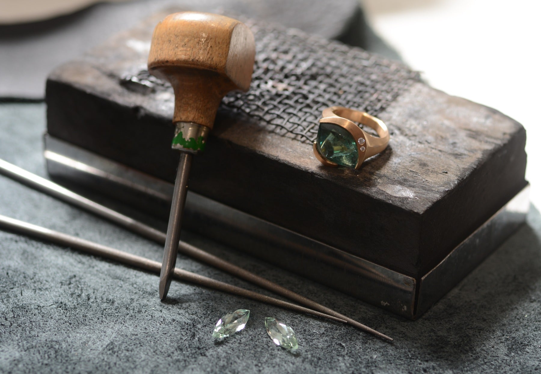 workbench with tools and jewellery - paraiba tourmaline and loose stones