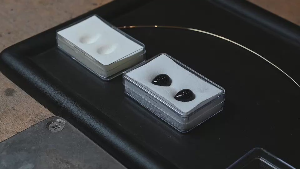 Each earring is carefully handmade in 18 carat gold wire to match the scale and shape of the pearl or precious stone, mirroring it's curves to create a light, but strong and wearable earring that complements the jawline.