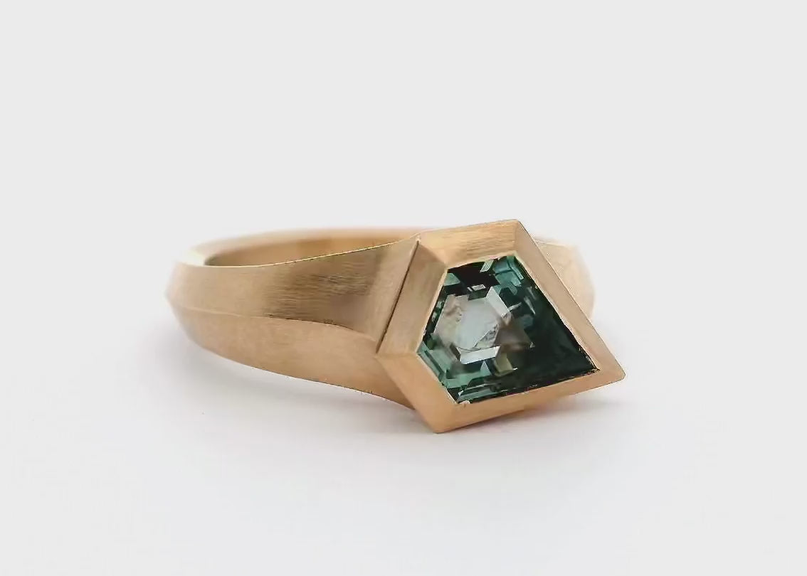 The shield shaped 1.18ct Montana sapphire has a subtle blue/teal hue to it which catches the light beautifully. Our Aegis collection is a modern take on classic solitaire engagement rings, first carved in wax, by hand, before being cast in 18ct rose gold.
