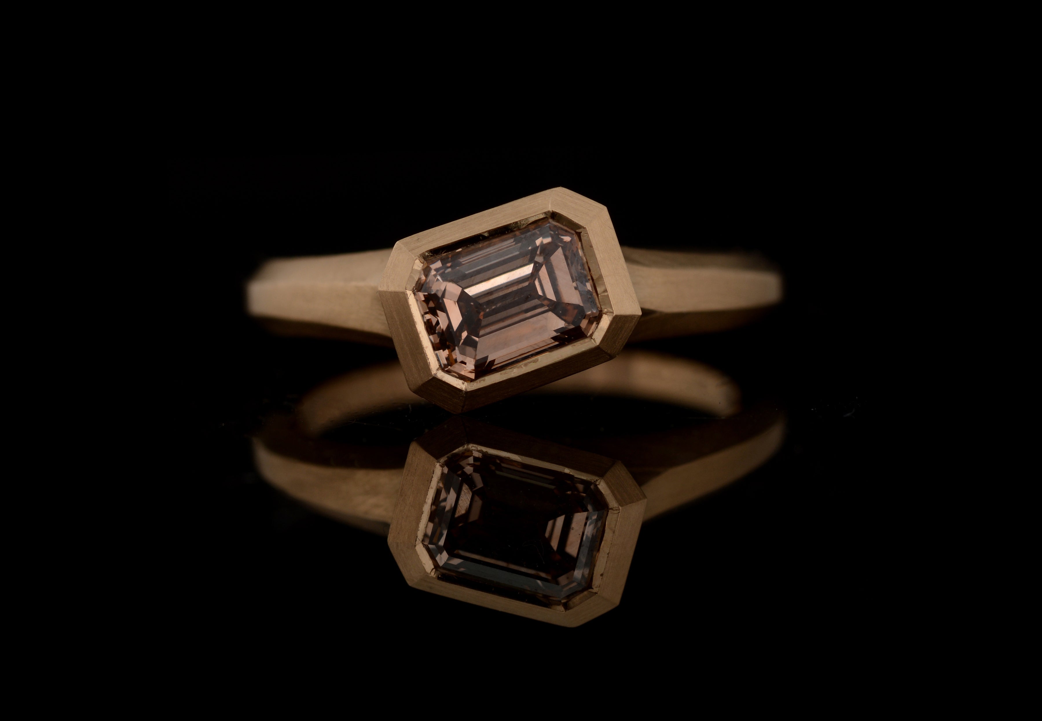 The nicely proportioned east-west orientated 1.05ct emerald cut diamond sits asymmetrically across the finger when worn. This hand carved ring features a bright cognac coloured diamond which is set within smooth satin 18ct rose gold. The ring is first formed by carving wax, it is then directly cast into precious metal. The design strikes a perfect balance between the organic fluid lines of the sculpted ring and the angular cut of the diamond.