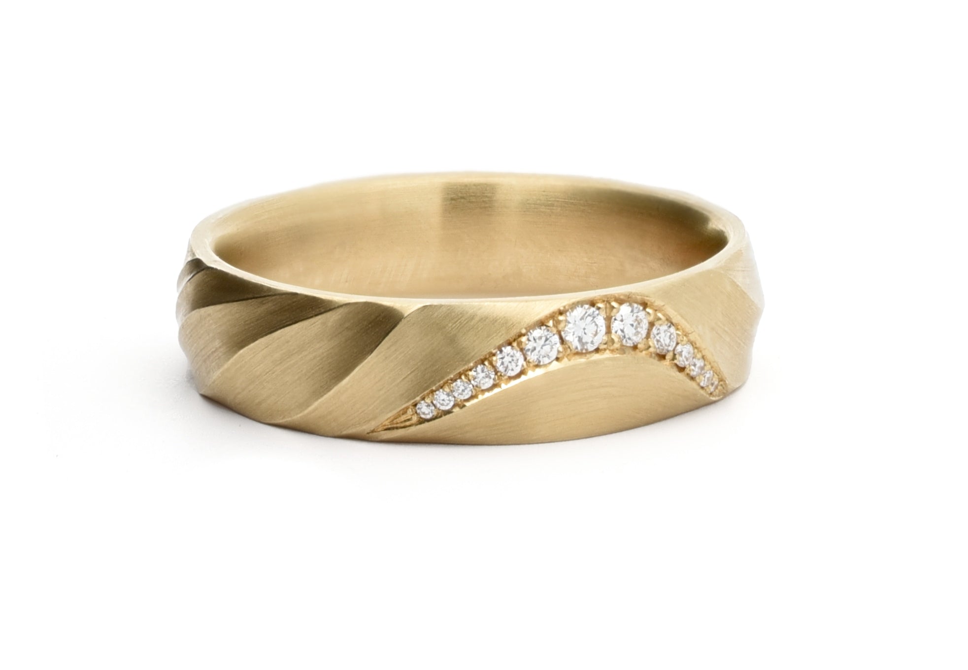 These rings are handcrafted and sculpted in wax before being cast into precious metal. The soft matt finish accentuates the undulating surface curves around the ring. The subtle ridges are delicately polished to add more detail to the texture of the ring.