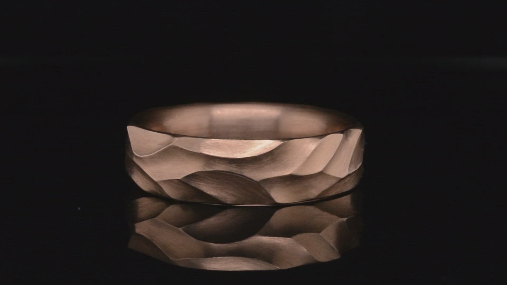 The soft matt finish accentuates the undulating surface curves around this unique wedding ring. The ridges are delicately polished to add more detail to the texture of the ring.