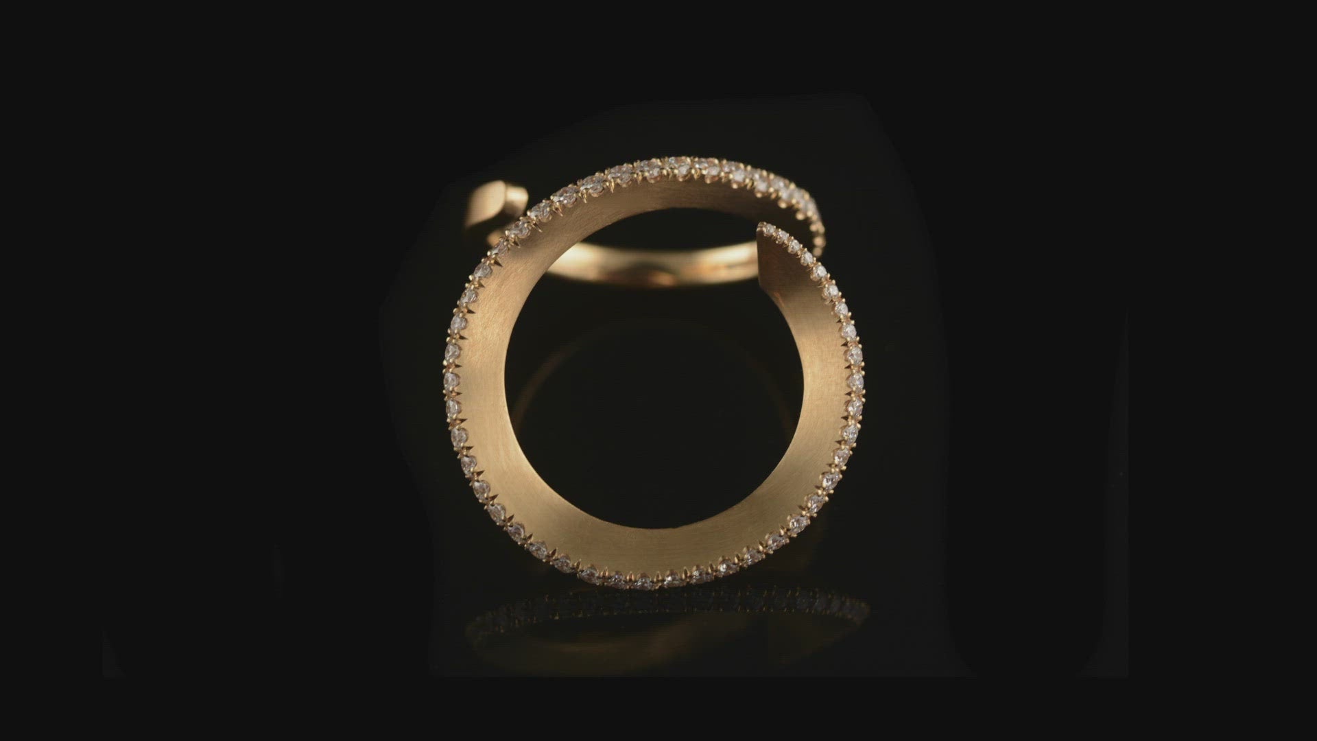 Turn heads with this 18ct rose gold and diamond cocktail ring. The playful tapering and looping form of the ring has been designed to sit perfectly on the hand. The deep circular curve of this rose gold and diamond cocktail ring is hand forged from 18ct gold bar and accentuated by a sparkling line of tapering pave white diamonds.