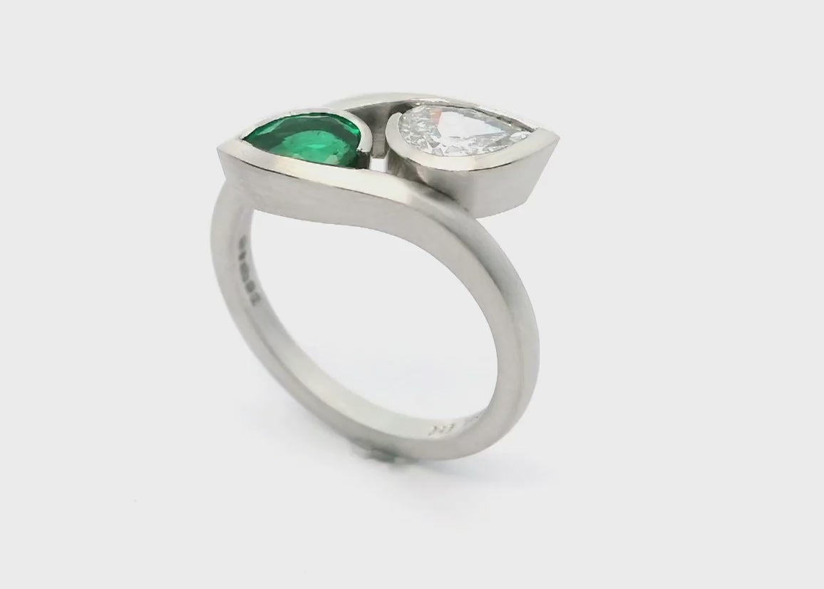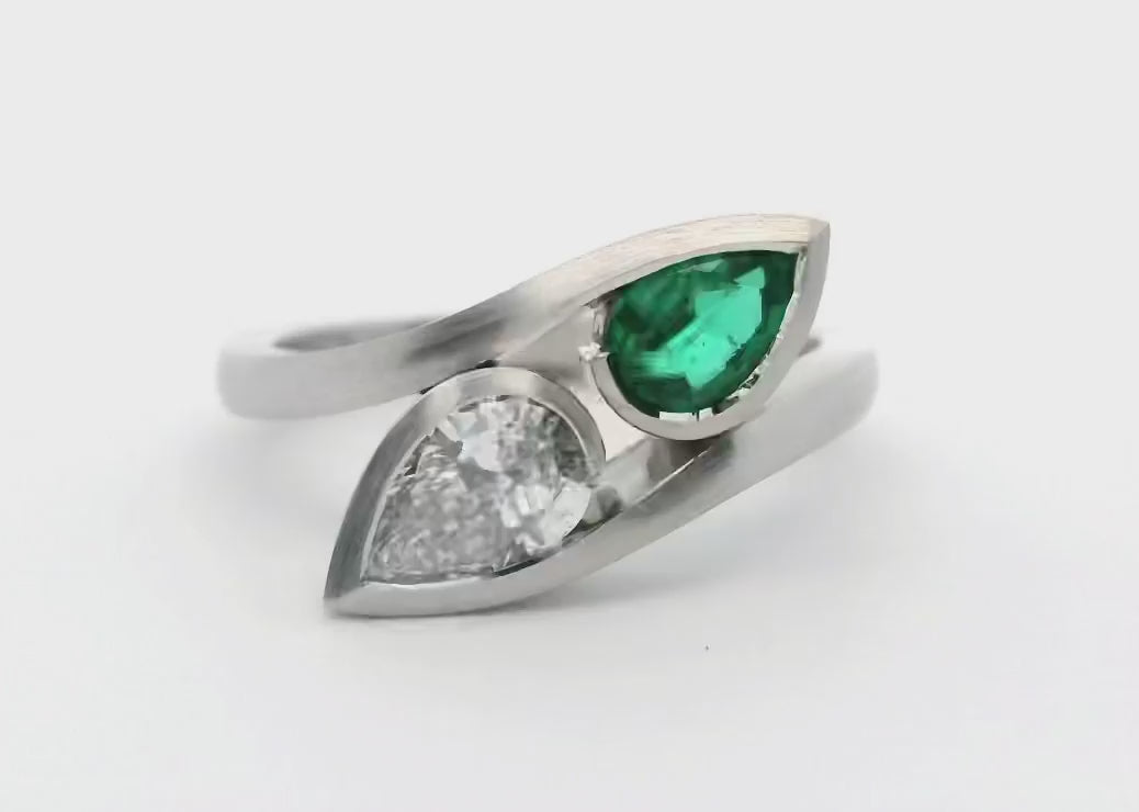 A one of a kind asymmetric colourful two stone ring, the Platinum Diamond and Emerald Moi Et Toi Wave Engagement Ring is the perfect unique engagement ring idea for modern women. It is an elegant yet modern statement engagement ring set with a sumptuous .50ct white diamond GIA and .32ct green emerald with our signature satin finish.