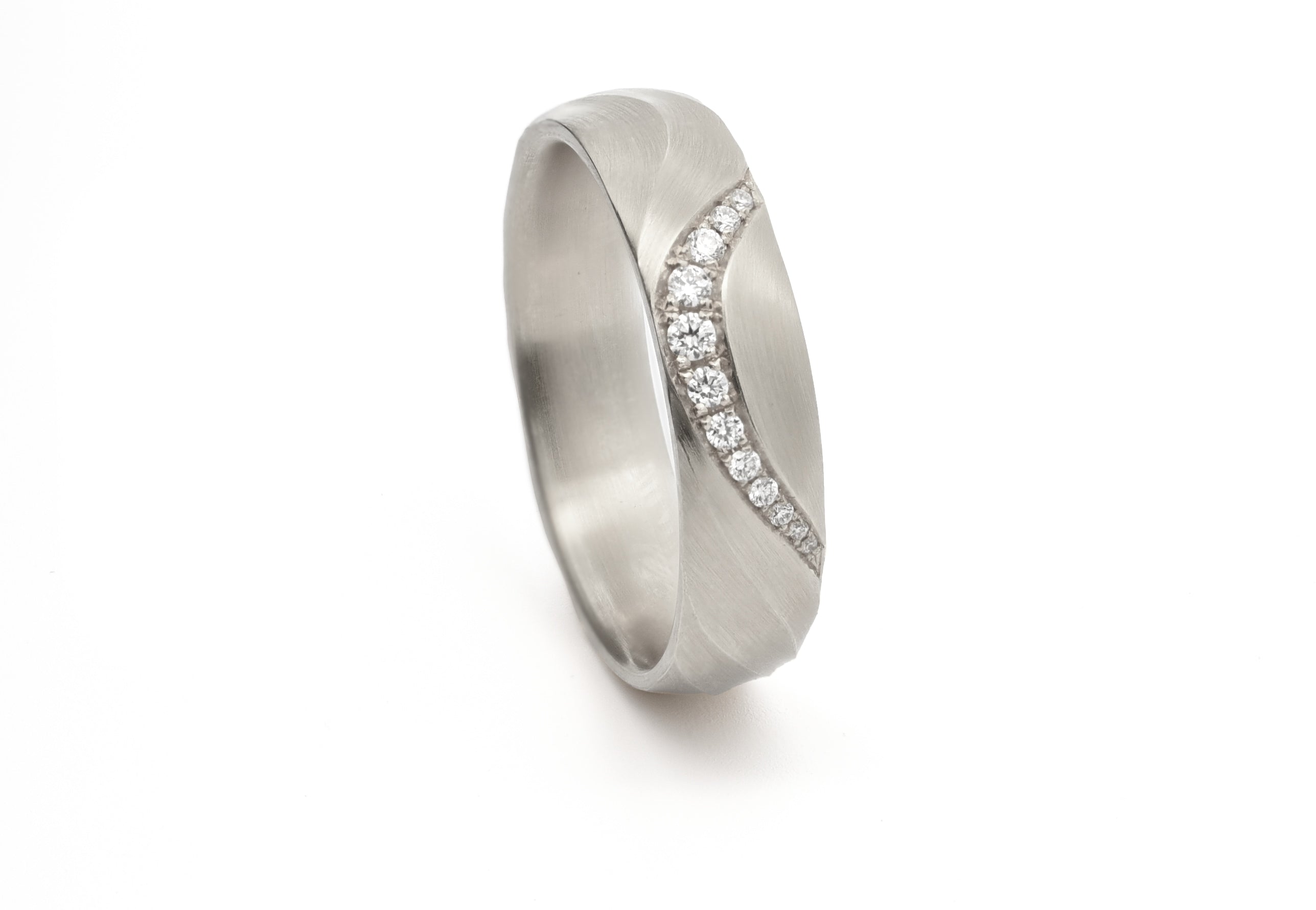The Platinum and white Diamond Set Aeolian II men's Wedding Band is the second iteration in the series, a uniquely curvaceous and fluid design. This unusual wedding ring is a perfect modern ring for men who like clean lines and want an alternative and contemporary wedding ring with added diamond detailing. It adds a little extra sparkle, with two tapering lines of diamonds, which accentuate the sculptural curves of the ring.