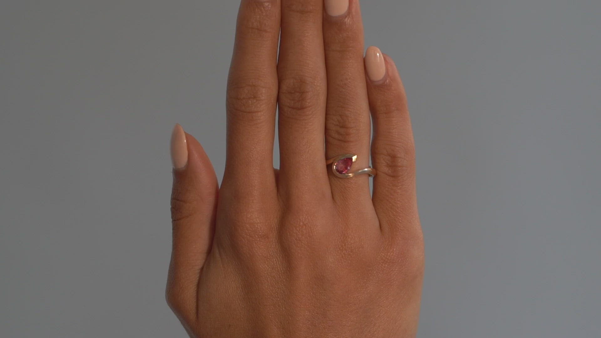 The 18ct Rose Gold Pink Sapphire Wave Ring is the perfect alternative engagement ring idea for a modern woman. Featuring a natural, untreated 1.06ct pear-shaped pink sapphire, this unique ring is an unusual and asymmetric twist on a solitaire engagement ring. The tapering lines of metal surround the shape of the sapphire gracefully. Asymmetrically placed, the setting and the ring follow the curve of the hand making it very comfortable on the finger.